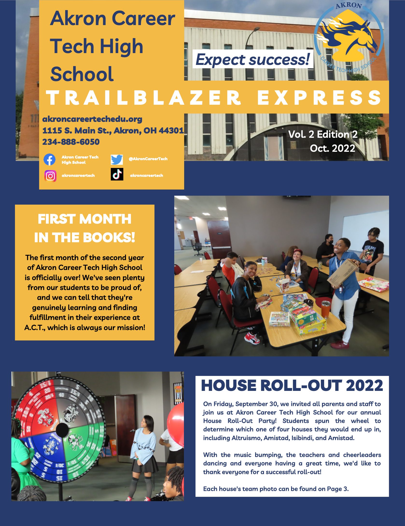We have wrapped up the first month of school! We completed STAR testing, had our house roll out, learning is taking place,students are participating in their career pathway learning, and we are planning homecoming! Read more about these news items and other important calendar dates in our latest newsletter.